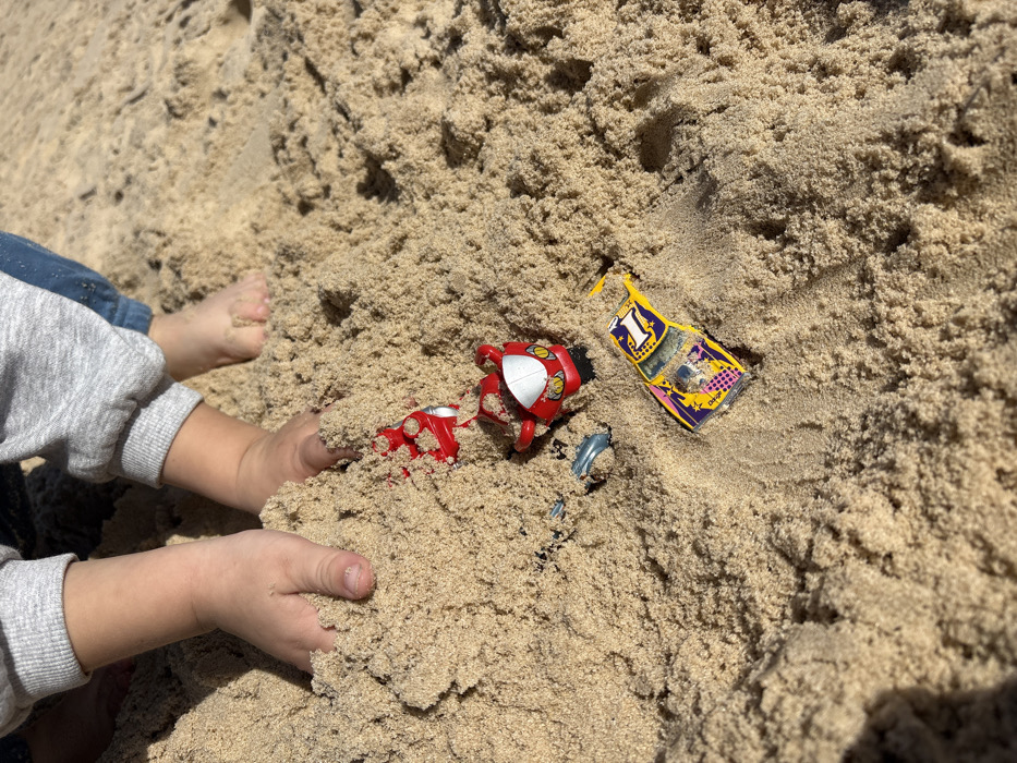 A close-up, high-angle image captures a child playing in the sand on a beach in Ashkelon, Israel. The child's bare feet and lower legs, partially covered by grey sweatpants and blue jeans, are visible in the upper frame. Two small hands are actively pressing into the light brown, granular sand. Embedded within the sand are three distinct objects: a red and white toy motorcycle or scooter, a yellow and purple toy race car featuring the number "1" on its rear, and a small, irregular metallic blue object. The scene is illuminated by direct sunlight, casting subtle shadows.