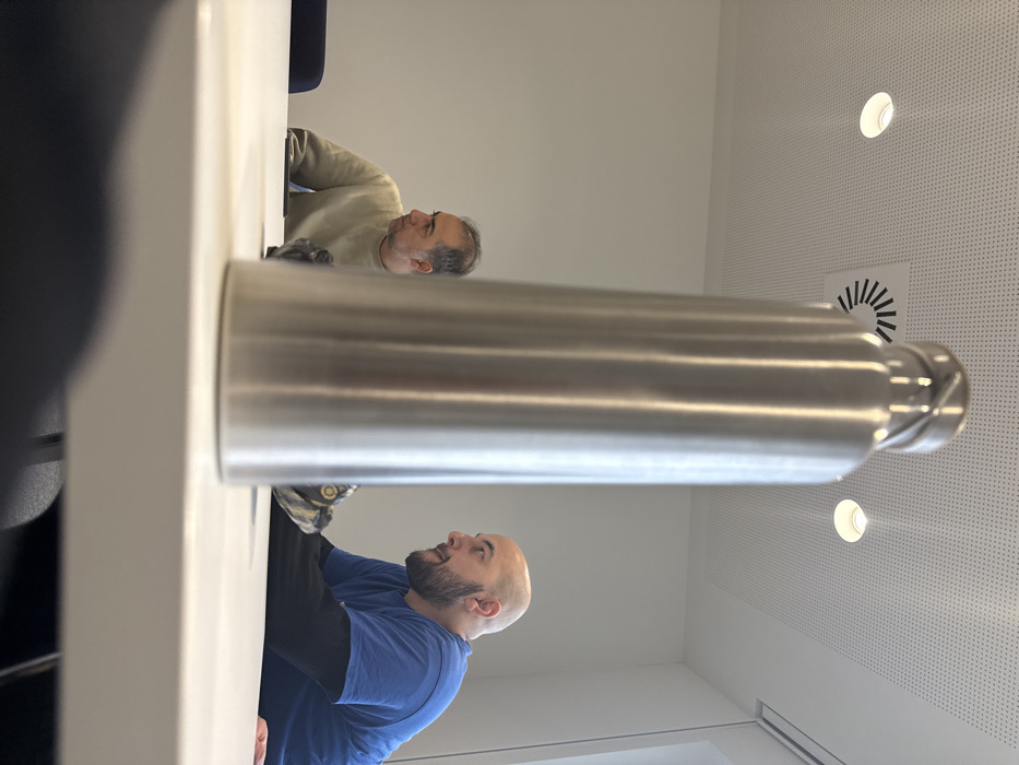 The scene is an interior shot of a modern meeting room located in Berlin, Germany. A tall, cylindrical, brushed stainless steel water bottle stands out of focus in the immediate foreground, positioned centrally on a white table. Behind the water bottle, two adult males are seated at the same white table. To the left, a man with short, greying dark hair, wearing a light-colored long-sleeved top, is visible from the chest up. He is looking towards his right, with his left arm resting on the table. A dark blue chair back is partially visible to his immediate left. To the right, a man with a shaved head and a dark beard, wearing a blue short-sleeved t-shirt over a black long-sleeved shirt, is also visible from the chest up. He is looking towards his left, displaying a slight smile, with his right arm resting on the table. A dark, indistinct object is partially visible on the table between the two individuals. The room's environment consists of plain white walls and a white acoustic tile ceiling featuring multiple recessed circular light fixtures and a square air vent with radial louvers. A partial view of a window or light source is present on the far right of the frame. The lighting within the room is bright and consistent. The men appear to be engaged in a shared observation or conversation, although no explicit interaction is depicted.