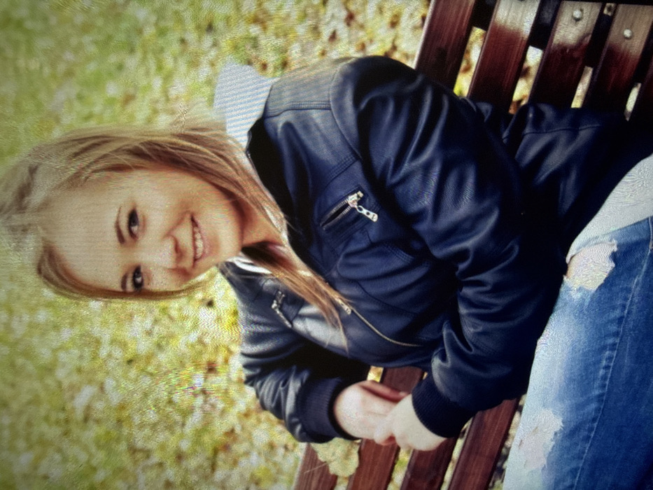 A young adult female is depicted seated on a dark brown wooden park bench in an outdoor park or garden setting in Dmitrov, Russia. She has light-colored hair, appears to be smiling, and is looking directly towards the camera. The individual is wearing a dark-colored, possibly black or dark blue, leather-style bomber jacket featuring zippered chest pockets and a visible central zipper. A light-colored undergarment, potentially a striped shirt or hoodie, is visible at the jacket's neckline. She is also wearing light blue distressed jeans with tears present on the knees. Her hands are clasped together on her lap or arm. The background exhibits green and yellowish ground foliage and grass, with scattered fallen leaves, consistent with an autumn or late summer environment.