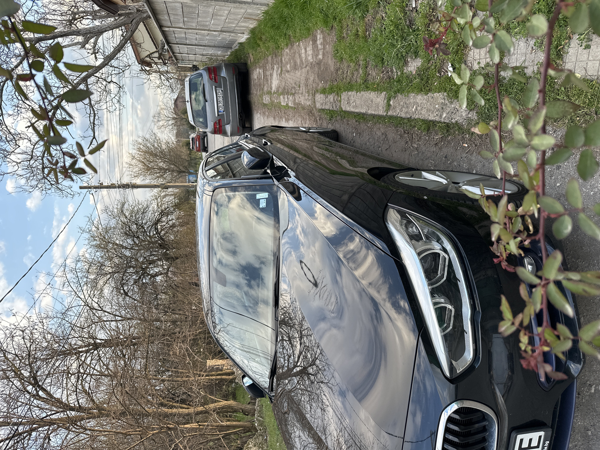 The image depicts a residential street or alleyway in Sofia, Bulgaria, as indicated by the "CB" registration code on a vehicle's license plate. In the foreground, a black BMW 1 Series is parked on the left, angled towards the right. Its front hood and windshield reflect a partly cloudy sky and bare tree branches. A branch with green and reddish leaves partially obscures the lower-left corner of the BMW's front bumper. The ground consists of a narrow dirt path with two concrete strips running lengthwise, flanked by grass and dirt. Further down the path, a grey Mercedes-Benz B-Class (license plate CB 3814 CH) is parked facing away from the viewer. In the distant background, a red SUV is visible on what appears to be a wider, paved road. To the right, a concrete block wall separates the path from a property where a building with a light-colored facade and a dark roof overhang is partially visible. On the left side of the path, bare deciduous trees with visible branches line the edge, suggesting late winter or early spring. Overhead utility lines are strung across the sky, with a utility pole visible on the left. The sky overhead is partly cloudy with patches of blue. No individuals are visible in the scene.