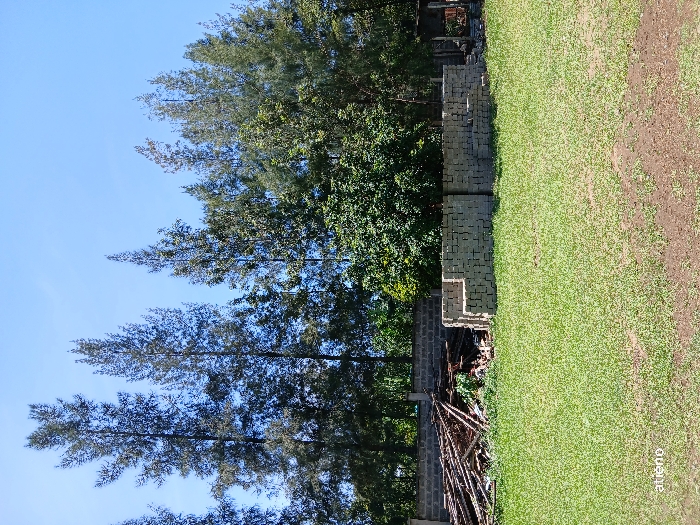 The scene depicts an outdoor environment in Kisumu, Kenya. A clear blue sky is visible above a horizon dominated by a line of tall, slender evergreen trees, interspersed with a denser, rounded deciduous tree. A low, unplastered grey concrete block wall extends horizontally across the mid-background. In front of this wall, from left to right, are two distinct collections of construction materials: a disorganized pile of wooden planks and timber, followed by several neatly stacked rows of light-colored concrete building blocks. The foreground consists of a manicured grassy lawn with scattered patches of bare, dark brown earth. No human figures are present.