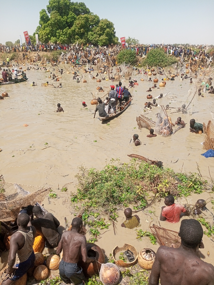 The image captures a crowded outdoor scene during a communal fishing event on a body of muddy, brownish-tan water in Kokani North, Nigeria