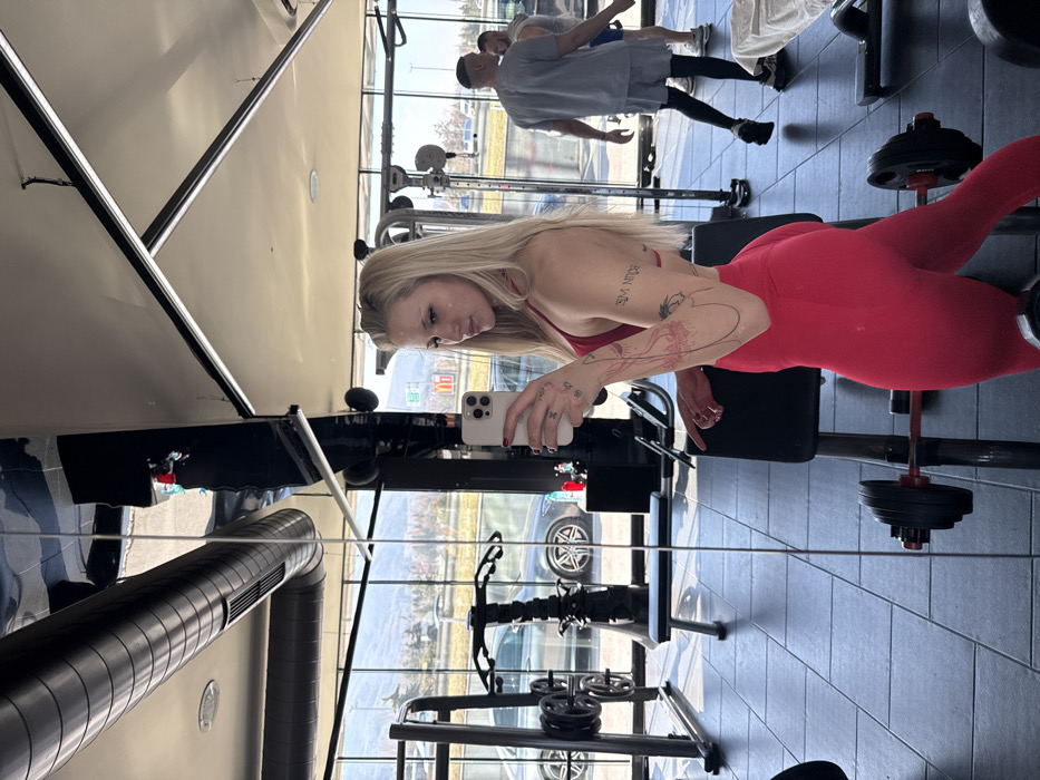 A young adult female is captured in a mirror selfie within a modern fitness center located at Bul