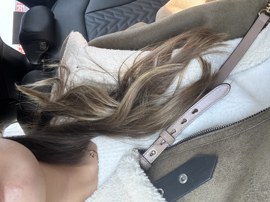 A close-up shot features a woman reclining in a car seat, with her head resting against a white, fuzzy surface. Her long, wavy brown hair cascades across a tan jacket with a fuzzy white lining, and a light pink leather strap lays on top of her jacket. A black leather strap lies on top of the jacket. A portion of her neck is visible, adorned with a delicate gold necklace. The car seat is upholstered in black, with a quilted diamond pattern.