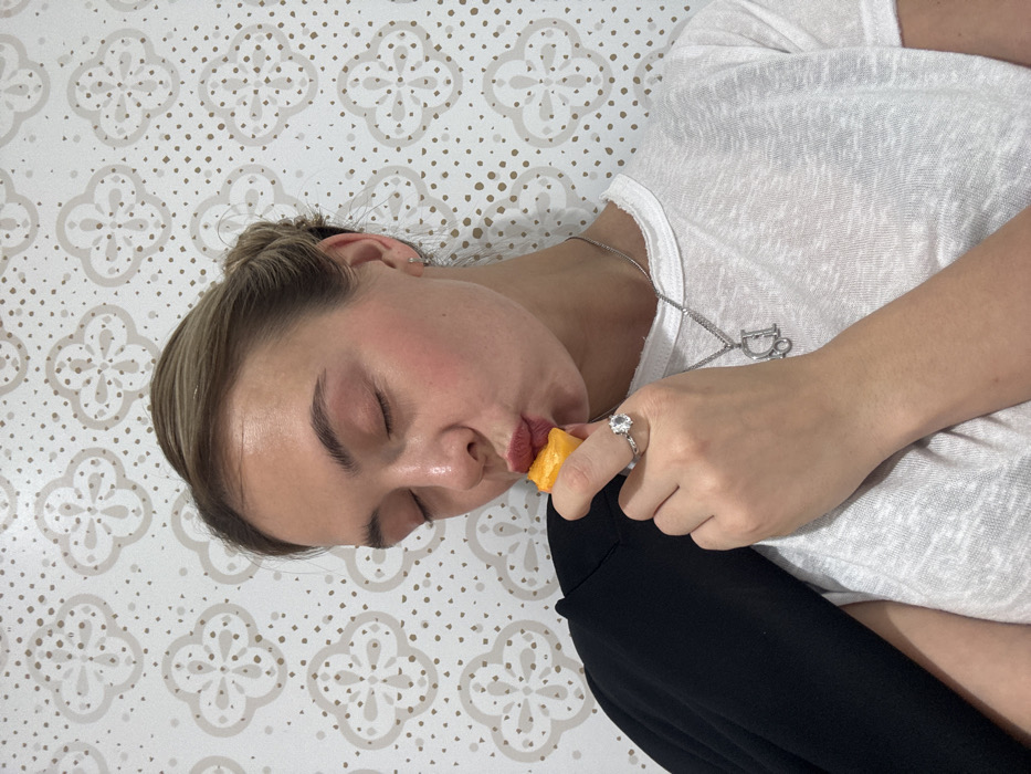 A female subject is depicted from the upper chest to the top of her head, centered in the frame against a patterned background. She has light-colored hair, pulled back, and her eyes are closed, with her lips pursed as if kissing or consuming an object. Her complexion shows a slight flush on the cheeks. She is wearing a white short-sleeved t-shirt with a visible silver chain necklace featuring a "Dior" pendant. A black garment, possibly a jacket or sweatshirt, is draped over her left shoulder. On her right hand, she wears a ring with a prominent light-colored stone on her ring finger. She holds a small, irregular piece of orange-colored food, possibly a fruit such as mango or orange segment, to her pursed lips with her right hand. The background consists of a light-colored wall (appears white or off-white) patterned with repeating beige or tan quatrefoil-like designs and small scattered dots. The specific location within the city of Ashdod, Israel, cannot be determined from the visual information available in the image.