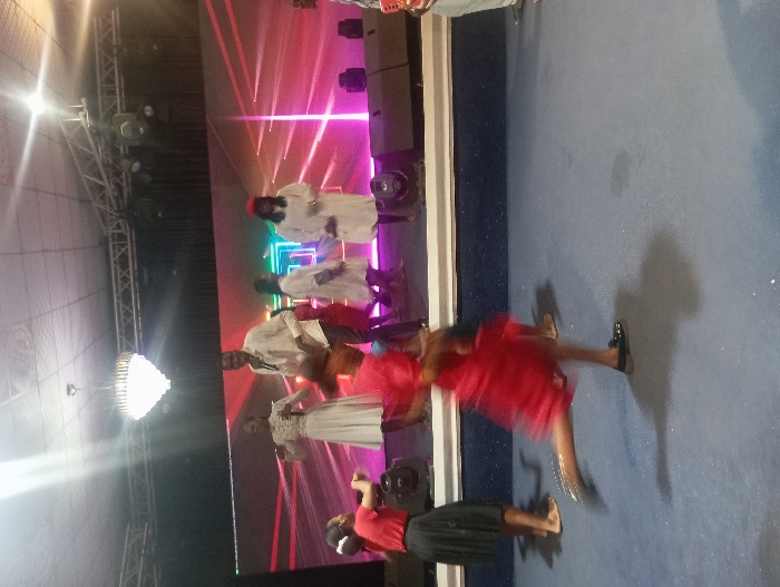 A blurred image features a stage with performers in white robes and formal attire. A person in red is in motion on the right side of the frame, creating a strong blur effect. Another person in a red shirt and dark skirt is partially visible on the lower left, also somewhat blurred. The stage background has bright, colorful lights. A chandelier and stage rigging are visible in the upper left. The floor appears to be blue and reflective.