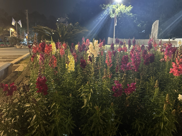 The image displays a nighttime view of a public area in Holon, Israel, specifically the landscaped grounds surrounding the Holon War Memorial located at the intersection of HaShmonaim Street and Pinsker Street. The foreground is dominated by a dense bed of brightly colored snapdragon flowers (Antirrhinum majus) in red, magenta, pink, orange, yellow, and white hues, illuminated by artificial light sources. A concrete curb marks the edge of the flower bed on the left, adjacent to a paved roadway where distant vehicles and two Israeli flags on poles are partially visible. In the background, a tall flagpole stands near the angular, light-colored stone structure of the Holon War Memorial. Dark trees and foliage are visible against the night sky. No people are present.