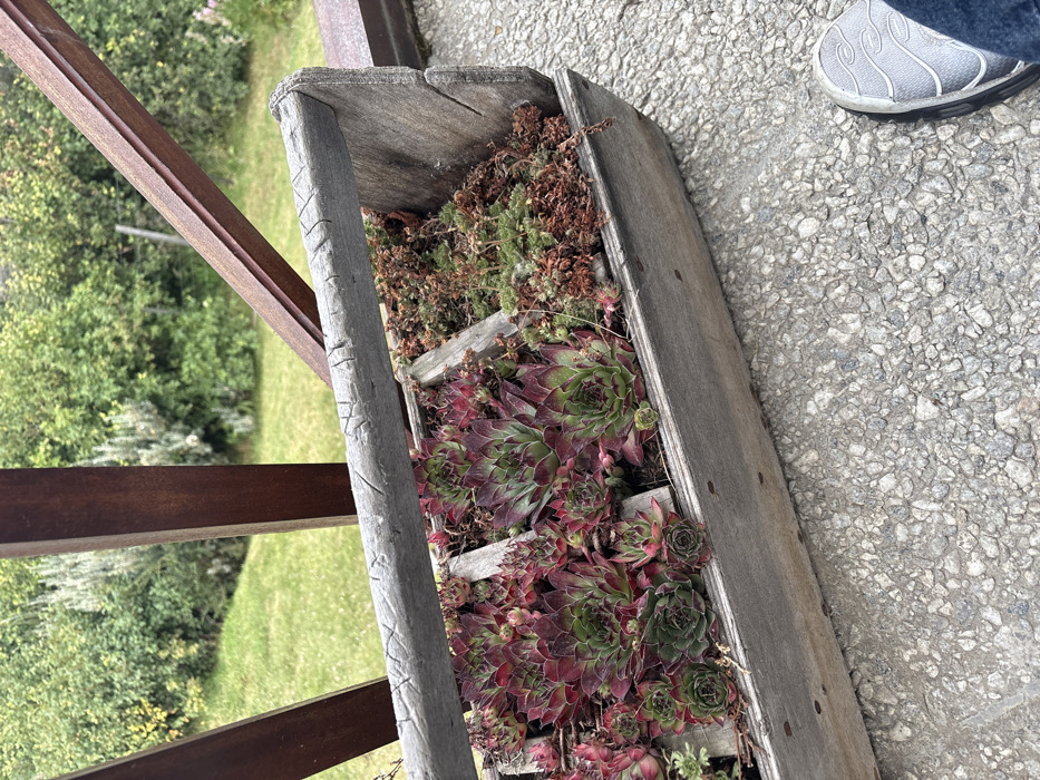 An aged wooden planter box overflows with vibrant succulents, predominantly red and green, contrasting against the weathered gray wood. The planter sits on a concrete surface near a brown railing. A foot in a gray shoe is visible near the top right corner. In the background, lush green vegetation suggests a garden setting. The scene is captured from a high angle, showcasing the textures and colors of the plants and surrounding materials.