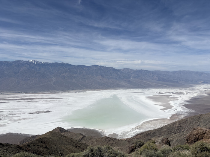 The image displays a panoramic, high-angle view of a vast desert basin in the vicinity of Unknown, United States, characterized by geological features consistent with Death Valley National Park. In the immediate foreground, dark, rugged terrain covered with sparse, dry, olive-green scrub vegetation slopes steeply downwards. The midground is dominated by an extensive, light-toned salt flat. A significant, irregularly shaped body of shallow, greenish water is present within the central and left portions of the salt flat, appearing as a temporary lake or brine pool. The periphery of the salt flat shows widespread white salt deposits forming intricate patterns against darker, exposed soil. The background features a long range of imposing mountains, predominantly dark grey and brown, stretching across the horizon. Several peaks in the distant mountain range are distinctly capped with patches of white snow. The sky above is a light blue with wispy, horizontally streaked white cirrus clouds. No individuals, animals, or man-made objects are present. The scene is illuminated by daylight under a partially clouded sky, depicting an arid natural environment.