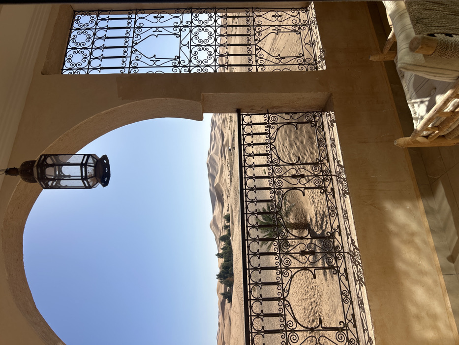 This image depicts a desert landscape viewed from an elevated balcony in Rissani, Morocco, under a clear, bright blue sky. The foreground shows an interior space with an arched opening framing the view. A dark, ornate metal lantern with glass panels hangs centrally from the archway's ceiling. A decorative black wrought-iron railing, featuring scrollwork and arched patterns, extends across the lower portion of the arch, marking the balcony's edge. To the right, a vertical beige pillar separates the archway from a window, which is also fitted with a matching wrought-iron grille. Sunlight casts distinct shadows from the railing and overhead structures onto the light-colored balcony floor and wall. In the lower right corner, a portion of a wooden chair or bench with light-colored striped cushions and a patterned throw blanket is visible. Beyond the railing, the midground consists of an expansive sandy desert with undulating terrain. A single small palm tree is visible directly below the railing, and a cluster of green trees, indicative of an oasis, appears further back. The background is dominated by numerous large, rolling sand dunes stretching into the distance under the cloudless sky. No people, subjects, actions, or interactions are visible within the scene.