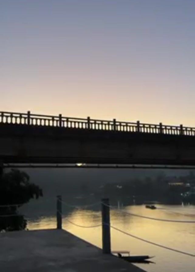 bridge silhouetted against a twilight sky over a body of water. The sky fades from blue at the top to a pale yellow near the horizon. The bridge has a distinctive railing with repeating arched details. Below the bridge, the water reflects the golden light of the sky. A concrete platform with wooden posts and rope sits in the foreground on the left. Trees and buildings are visible on the opposite shore, and a couple of boats are on the water.
