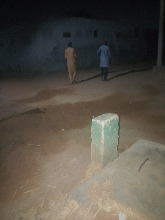Two people are walking away from the viewer in a poorly lit outdoor environment. One wears a tan robe-like garment, the other a light blue top. They cast long shadows on the ground. In the foreground, a weathered concrete post, possibly painted with green, stands next to a larger, flatter concrete structure. The ground is dirt and straw-like debris. A dimly lit building can be seen in the background.