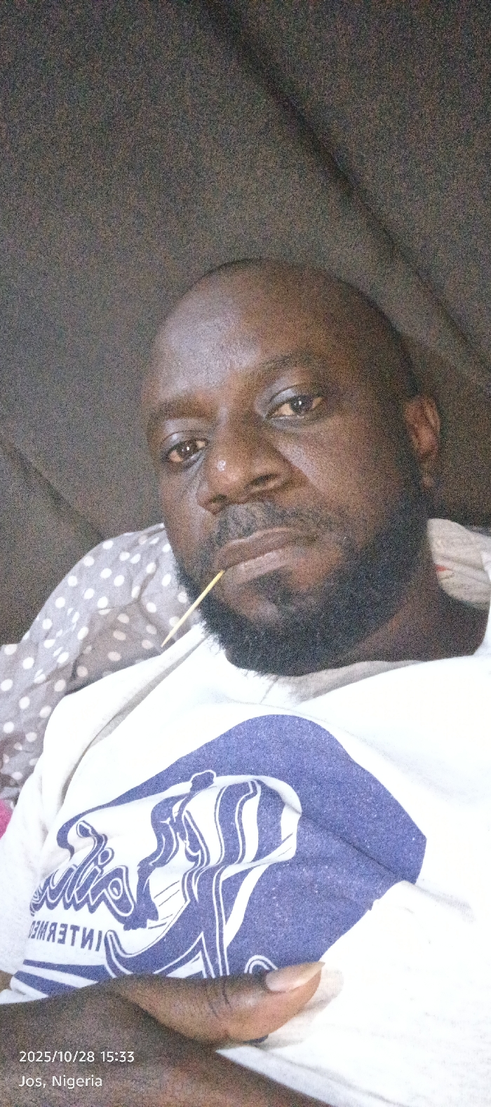 An adult male with dark skin, a bald head, and a dark beard and mustache is captured in a close-up, slightly high-angle indoor selfie. He wears a white t-shirt with a prominent blue graphic design on the chest, which includes stylized patterns and mirrored text, partially legible as "INTERNET". A light-colored toothpick is horizontally held between his lips. His dark eyes are directed forward with a neutral expression. Behind him and to his left, a light-colored fabric with white polka dots is visible, consistent with bedding or upholstery. The background to the right is a darker, plain fabric. The subject's right hand, showing a long fingernail, is partially visible at the bottom right. An overlay on the bottom left indicates the timestamp "2025/10/28 15:33" and location "Jos, Nigeria".
