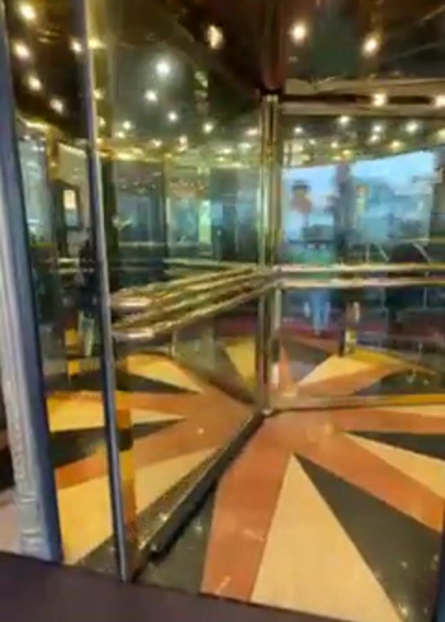 interior of a revolving door. The walls are mirrored, and there are gold-colored accents. The floor is patterned with black, brown, and beige triangular segments radiating from the center. The revolving door is made of clear glass panels and has a gold-colored handrail. Through the glass, a restaurant or bar is visible with tables, chairs, and people. The ceiling is reflective and has recessed lighting. The video appears to be taken from inside the revolving door.