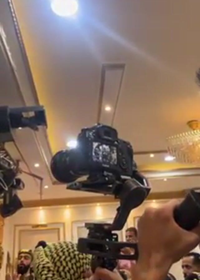 Canon camera mounted on a gimbal, being held by a person. The camera screen displays a black and white image of a group of people, including one with a turban. The camera operator is standing in a room with gold accents and what appears to be an event space. Other people are visible in the background.