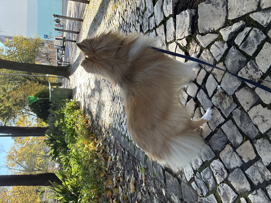 - "A long-haired, light brown and cream-colored dog, possibly a Shetland Sheepdog, stands on a traditional Portuguese cobblestone path (calçada portuguesa) in the Jardim do Campo Grande, Lisbon, Portugal" by FM-dxbXj1, licensed under CC BY 4.0