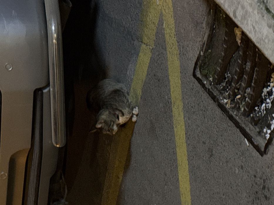 A domestic tabby cat, exhibiting grey-brown fur with darker stripes, white paws, and a dark collar, is situated on an asphalt surface in Varna, Bulgaria. The animal is in a crouched sitting posture, facing left, positioned directly beneath the rear bumper of a light-colored vehicle, likely an SUV, which displays visible parking sensors and a chrome exhaust component. Two parallel yellow lines are painted horizontally across the asphalt. In the lower right foreground, a metal storm drain grate is visible, partially filled with debris, including what appears to be cigarette butts and minor vegetative growth. The scene is observed under ambient, low-light conditions.