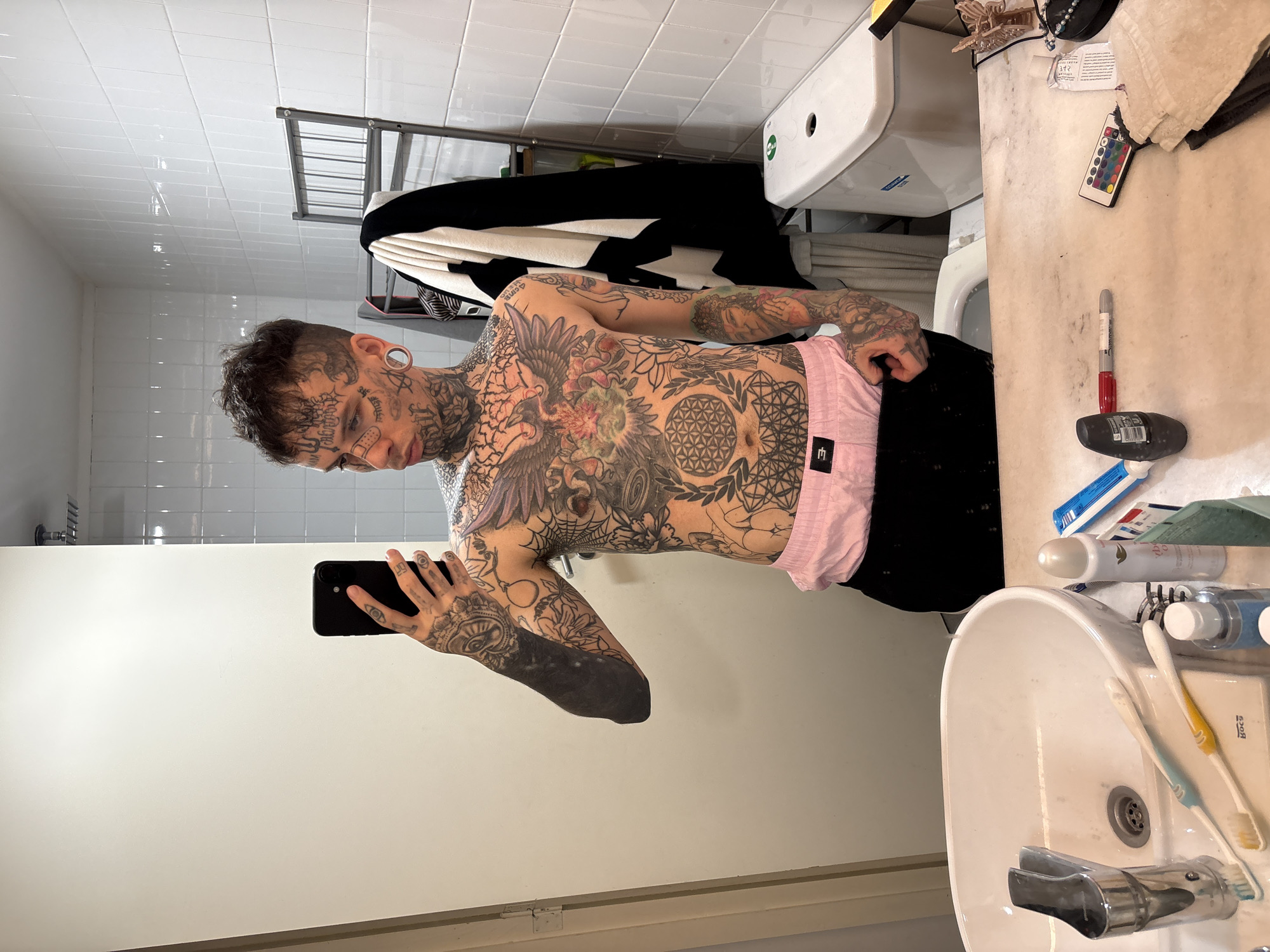 A heavily tattooed shirtless man takes a selfie in a bathroom with white tiled walls. The bathroom contains a sink, a toilet, and a towel rack. The man has numerous tattoos on his face, neck, torso, and arms. He is wearing pink boxer shorts. The countertop next to the sink holds various toiletries, including toothbrushes, toothpaste, and deodorant. The photograph appears to be taken in an indoor residential setting, likely a private bathroom. The location in Buenos Aires, Argentina is not possible to verify from the image.