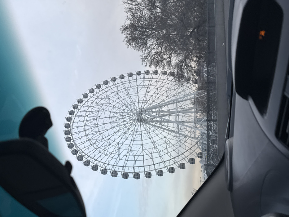 A large Ferris wheel dominates the scene, its structure intricate and white against a pale sky. Some bare trees frame the upper portion. The view is captured from inside a vehicle, indicated by the car's interior elements visible on the right and left, including part of the dashboard and a mirror. The composition is slightly tilted, adding a dynamic feel to the image.
