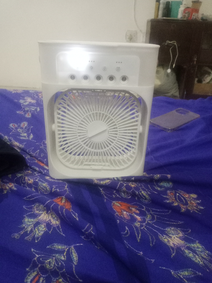 - "A white portable air cooler with a square fan grill sits on a blue floral patterned bedspread" by FM-dnVxn2, licensed under CC BY 4.0