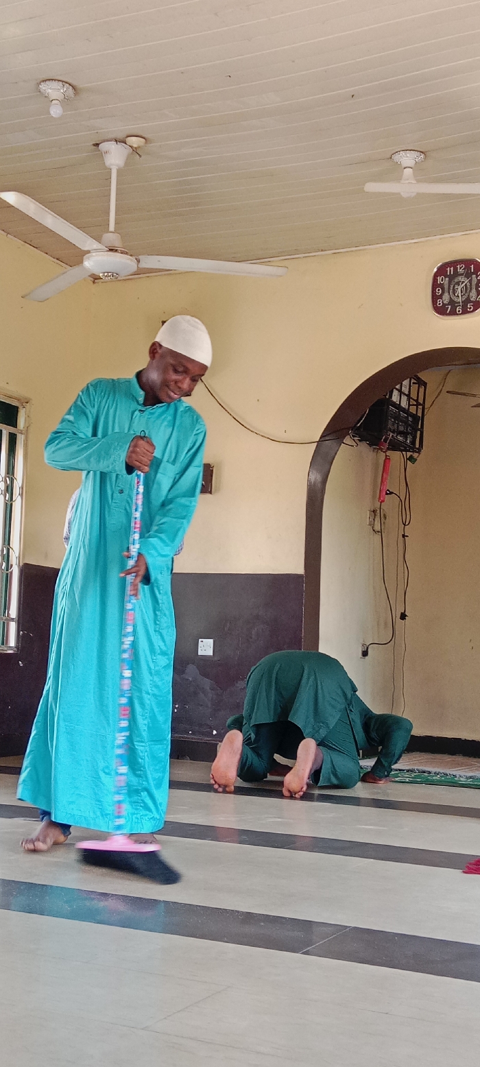 The scene, identified as being in Lokoja, Nigeria, depicts the interior of a building, likely a mosque or religious space. Two individuals are present on a light-colored tiled floor with dark horizontal stripes. One male subject, light-skinned, stands approximately centered in the frame. He wears a light blue long-sleeved robe (thobe or jalabiya) and a white prayer cap (kufi). He is barefoot. He holds a stick-like object, predominantly blue and white with patterned segments, held vertically with both hands near its lower end. His head is tilted downwards, and he displays a smile on his face. Partially obscured behind him on the floor is a pink-headed broom with black bristles. A second individual, wearing a dark green long-sleeved garment, is visible in the background to the right, in a state of prostration (sujood), consistent with Muslim prayer. Their bare feet are clearly visible, with toes curled under. A patterned green prayer mat is partially visible beneath them. The room features light yellow/beige walls. On the left, a window with white security bars or a grille is visible. The ceiling is white and paneled, featuring two white ceiling fans, one centrally located and another partially visible on the far right. A small, exposed light bulb is also mounted on the ceiling. On the right wall, a square red-framed clock with Arabic numerals and script indicates approximately 12:45. Below the clock, a dark brown arched opening leads to another area. Mounted on the wall above this archway is a black, caged electronic device, possibly an inverter or sound system, with associated wiring visible. A red cylindrical object hangs below this device. White electrical outlets are visible on the walls.