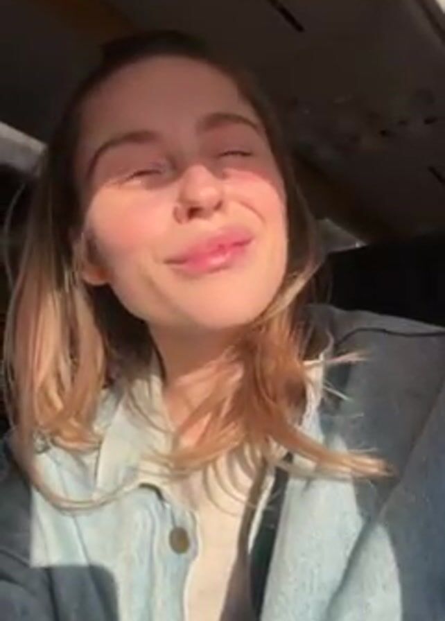 A fair-skinned woman with light brown hair, wearing a light blue denim jacket over a grey top, is the focus of the video. She's indoors, seemingly on a bus or airplane, as suggested by the interior and overhead panel visible in the background. Sunlight streams in, illuminating her face and casting shadows. Her facial expression is soft, with a slight smile and occasional squinting due to the brightness. The jacket features a small tag with the letters "BUGJO" visible on the bottom right.
