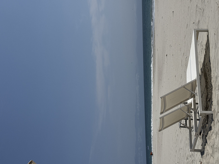 The image depicts a daytime scene on a sandy beach in La Cruz de Huanacaxtle, Mexico. In the immediate foreground, two white-framed beach loungers with light-colored mesh fabric are positioned on the light tan sand, facing the ocean. A partial view of a white beach umbrella or structure is visible at the extreme upper left. The sandy beach extends into the midground, meeting the ocean where gentle waves break along the shore. The water is a deep blue-green hue. In the distant left, two indistinct human figures are visible on the wet sand near the water's edge, and a small, light-colored boat is present further out in the water. The horizon features a hazy line of distant mountains or land. The sky occupies the upper portion of the frame, appearing predominantly clear and light blue, with some wispy white clouds scattered across the lower sky. Small, dark specks, possibly birds, are visible in the upper sky.