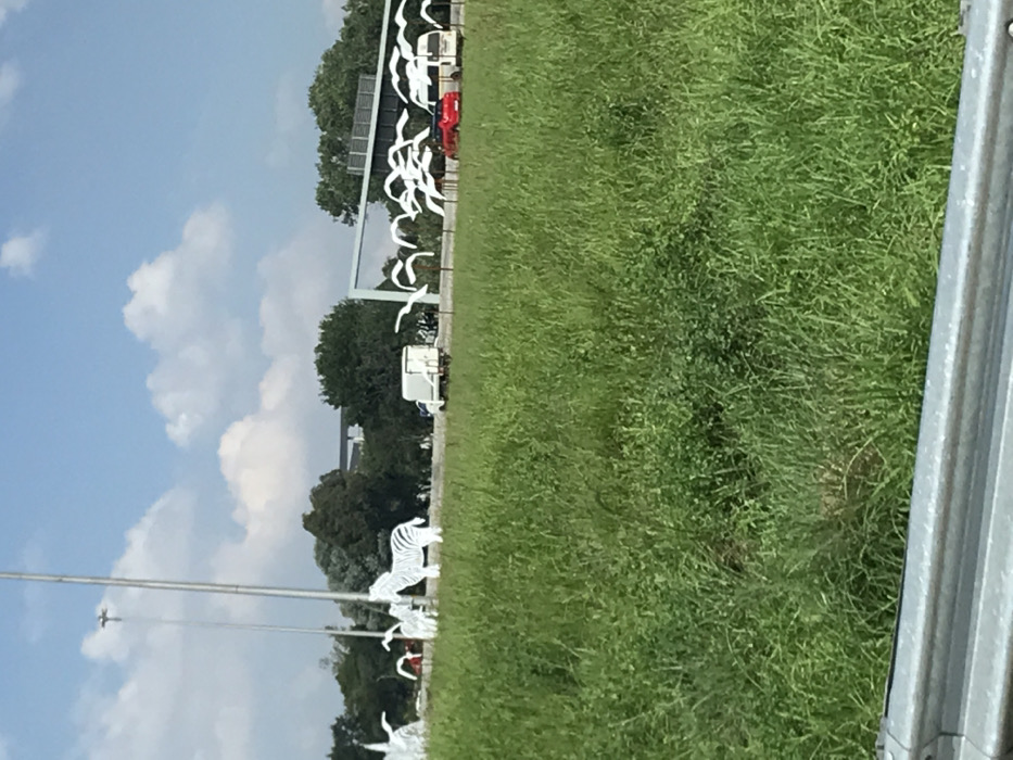 This image captures a daytime scene along the N3 highway near the Geldenhuys Interchange in Germiston, South Africa. The view is from an elevated perspective, looking across a roadside area towards the highway. In the immediate foreground, a metallic silver highway guardrail spans horizontally across the lower portion of the frame, partially obscuring a dense growth of green grass and weeds. Beyond this, a wide grassy median strip separates the viewpoint from the active highway lanes. On the left side of the median, a group of white, two-dimensional animal sculptures is visible. These include a prominent zebra with distinct black stripes, accompanied by several smaller, lighter-colored quadruped figures to its left, and a larger, abstract white sculpture further to the left. On the right side of the median, a dense formation of white, two-dimensional bird sculptures, resembling flamingos or cranes in flight, are arranged, all oriented towards the right. Behind the median, a multi-lane highway is in operation. A white box truck is observed moving from left to right. Following it are a red hatchback automobile and a white passenger van (likely a minibus taxi), both also facing right. The background features a tall, slender grey light pole with a crossarm on the left. Further back, a large grey overhead highway sign gantry spans the road. A line of green trees and some indistinct dark buildings are visible along the distant horizon. The sky is blue with scattered white cumulus clouds. No individuals are directly visible or identifiable within the vehicles or on foot.