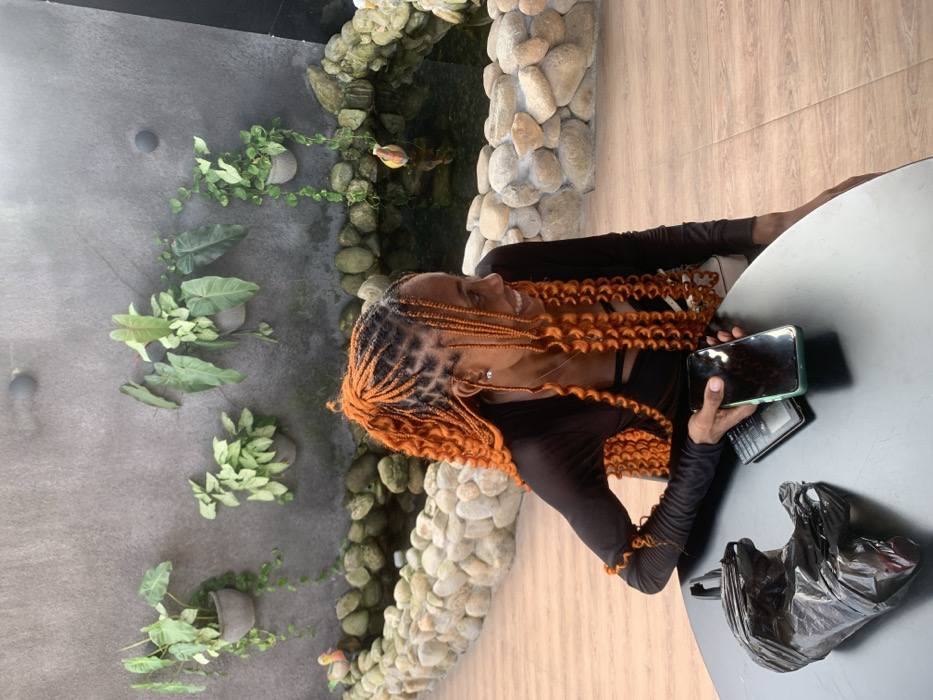 A young adult female is seated at a black round table, holding a green-cased smartphone in her right hand. Her hair consists of bright orange braids, some styled upwards, others falling in long, curly strands. She wears a black long-sleeved top with chest cut-outs and a small earring. She is smiling and looking towards the right of the frame. On the table, to her left, rests a dark-colored feature phone and a crumpled black plastic bag. The background features a textured grey wall with four potted plants mounted at varying heights. Below the wall is a decorative water feature or pond bordered by light-colored, rounded stones. Two small, multicolored duck figurines are visible within or near the water. The floor is covered with light-toned plank-style flooring. The scene is set in what appears to be a cafe or lounge environment in Calabar, Nigeria.
