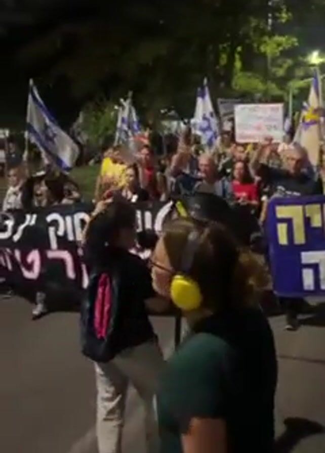 nighttime political protest. A woman in a green shirt and yellow ear protectors yells into a megaphone, leading a crowd. Many protestors hold Israeli flags, banners in Hebrew, and smaller signs. Some protestors chant and raise their fists. The setting is an urban street lined with trees. Streetlights illuminate the scene. The crowd appears passionate and active.