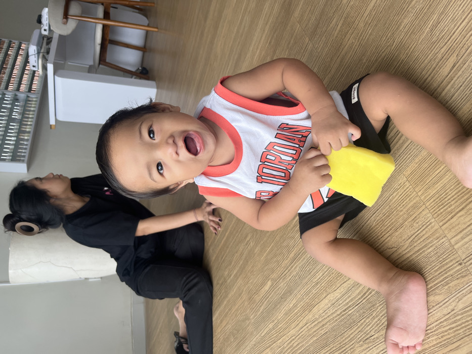 The image captures an indoor scene in Uluwatu, Indonesia. In the foreground, a light-skinned infant or toddler with dark hair sits barefoot on a light wood-patterned floor, facing the camera with an open mouth and direct gaze. The child wears a white sleeveless top with red trim, featuring "AIR JORDAN" in red text, and black shorts, holding a bright yellow rectangular object with both hands. In the mid-ground, an adult female with dark hair pulled back by a light brown claw clip sits on the floor to the left, facing right and looking away from the camera. She is dressed in a black t-shirt and black pants, with her left hand resting on the floor. The background features a light grey wall, a tall cylindrical object, and a white wall-mounted display unit filled with multiple rows of small bottles, indicative of nail polish or cosmetics. A modern white desk and a chair with a wooden back and light grey cushion are positioned beneath the display unit.