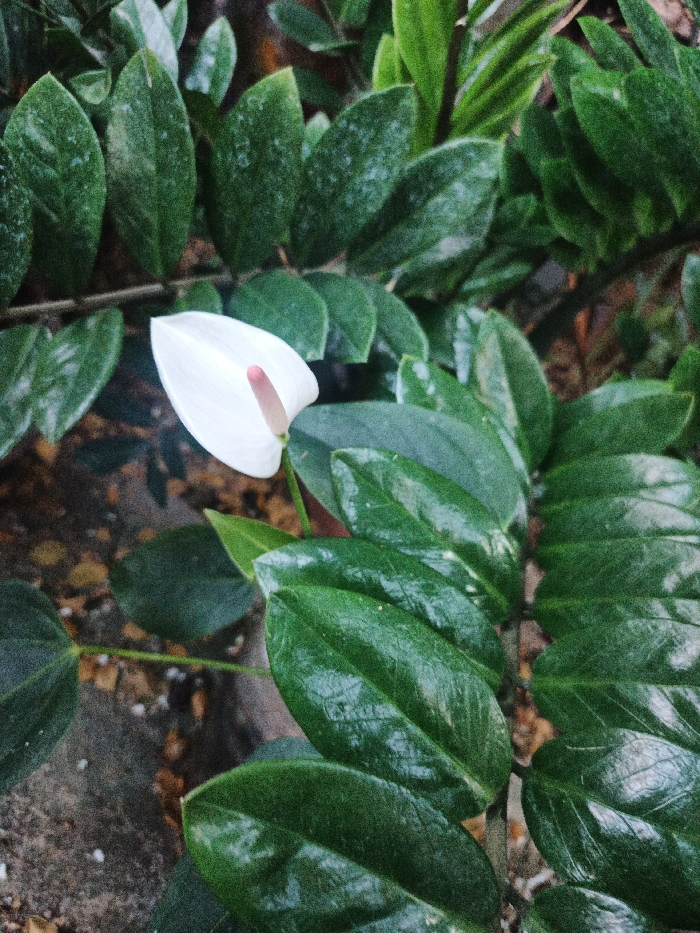 A single white Anthurium flower, featuring an elongated white spathe and a central, erect, light pink spadix, is positioned in the upper-left quadrant of the image. The flower is partially surrounded by and intermingled with numerous dark green, glossy, ovate leaves, consistent with Zamioculcas zamiifolia (ZZ plant) foliage. These leaves exhibit minor surface imperfections, possibly dust or water residue, and are densely arranged throughout the frame. The background and lower portions of the image reveal dark, granular soil or ground cover with sparse, lighter-colored particulate matter. The scene is illuminated by diffuse natural light. This location is in Tinaco, Venezuela.