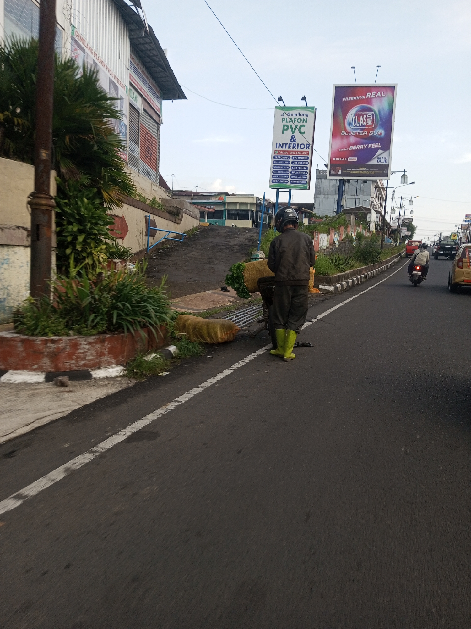 The image captures a street scene in what appears to be a built-up area. A man wearing a helmet, jacket, trousers, and bright yellow boots is standing next to a motorcycle, which is heavily laden with what seems to be vegetation or produce. The man is facing away from the camera. He is positioned on the side of the road, close to a white lane divider. On the other side of the road, there is a raised section with vegetation and a ramp leading up to a higher level. On the right side of the road, a motorcyclist and a taxi are driving in the same direction as the man. Visible in the background are two large billboards advertising "Gemilang Plafon PVC & Interior" and "CLAS Bluetea Duo". Overhead power lines stretch across the sky. The general setting suggests an urban or semi-urban environment.