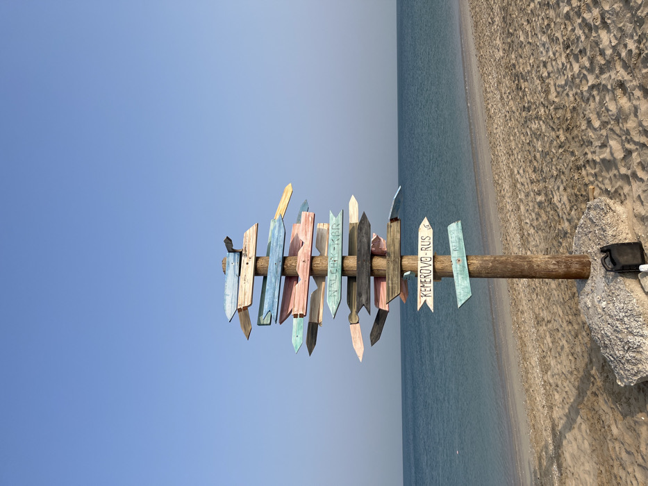 A weathered wooden signpost stands on a sandy beach beside the ocean. The post is adorned with multiple colorful, mismatched wooden planks acting as direction signs. One sign reads "KEMEROVO-RUS." A small black bag sits at the base of the signpost, resting on a mound of light-colored rocks or concrete. The blue sky is visible behind the signpost.