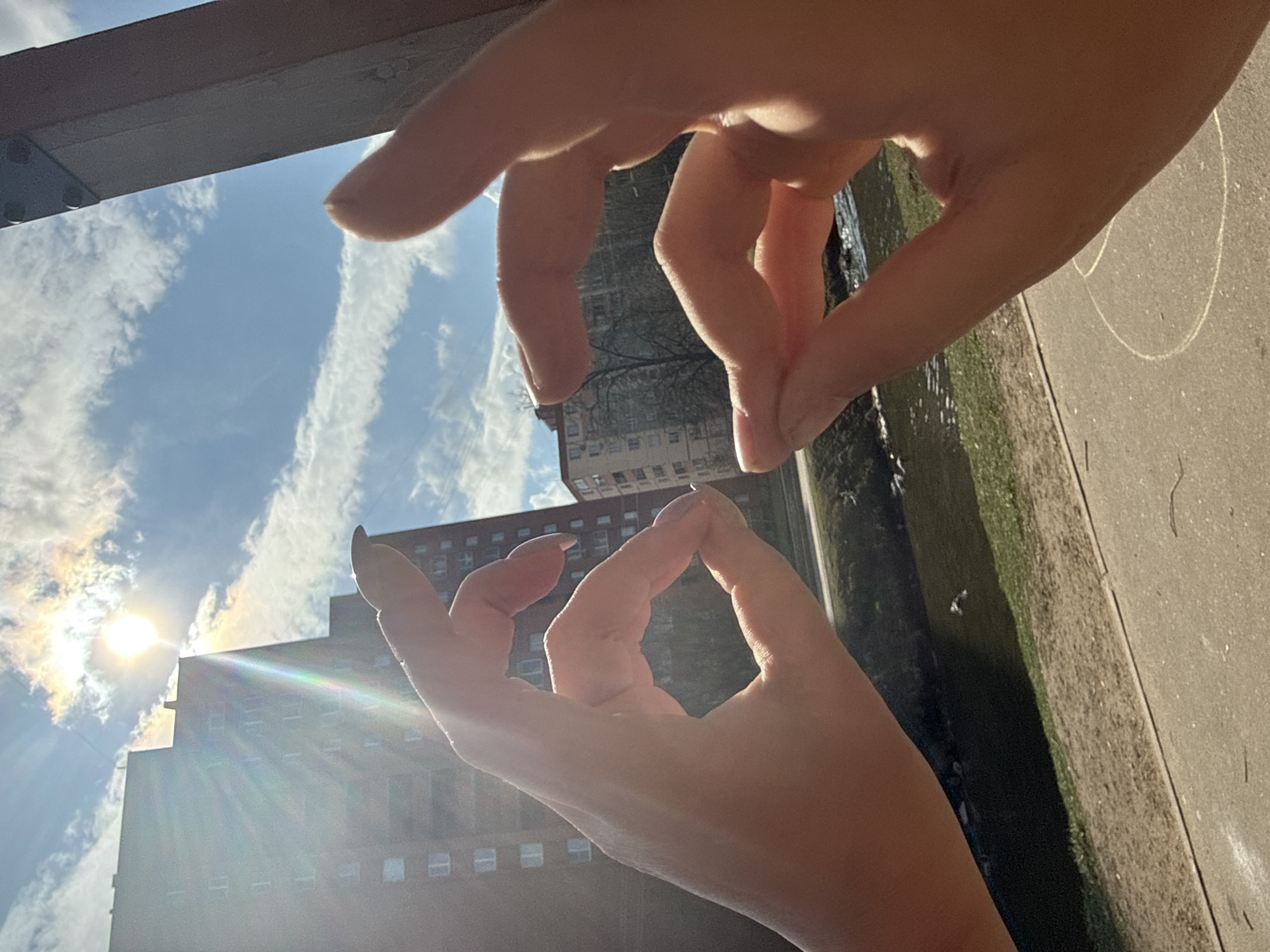 Two hands are positioned in the foreground against an urban backdrop. One hand is positioned above the other with fingers curved to form circular shapes. The background includes a bright sun, blue sky, and tall buildings. The setting appears to be Dmitrov, Russia, indicated by the architecture. A sidewalk and some greenery are visible on the right side of the frame.
