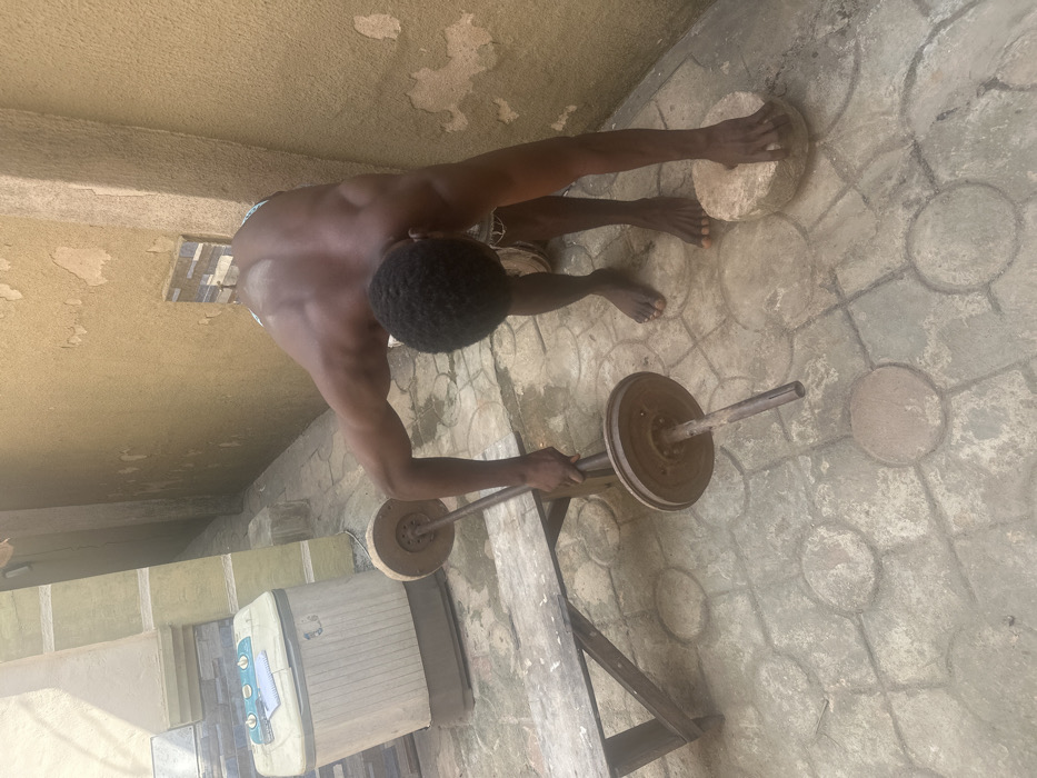 - "The image depicts a shirtless male individual engaged in a weightlifting exercise in an outdoor, paved area within a residential setting in Nnewi, Nigeria" by FM-gQaK92, licensed under CC BY 4.0