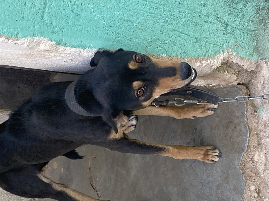 A black and tan dog, likely a mix, is lying on a grey concrete surface. The dog has a thick, black collar and is attached to a silver chain. It's facing the camera with amber eyes. The dog has tan markings on its muzzle, chest, and legs. Behind the dog is a wall with a turquoise painted top section and a white base. The dog's pose suggests it might be resting or looking up inquisitively.