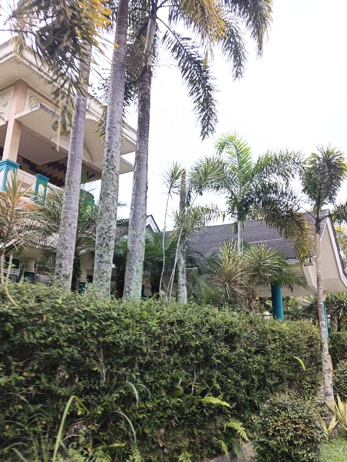 The scene is located in the city of Unknown, Vietnam. It presents a tropical landscape featuring dense green foliage in the foreground, primarily composed of a maintained hedge. Multiple tall palm trees with smooth, light grey trunks and visible fronds rise through the midground. Behind these, additional smaller palm trees and assorted tropical plants are present. On the left, a multi-story building with a pale facade displays balconies accented with light blue decorative railings. To the right, a structure with a dark gabled roof and a light-colored, angular canopy supported by a prominent turquoise column is visible. The sky is uniformly overcast. No human subjects or active events are depicted.