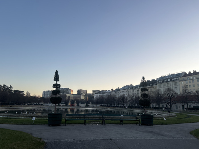 This image displays a static, late afternoon or early evening scene within the Stadtpark in Vienna, Austria, centered on its large, oval-shaped pond. The sky transitions from clear, deep blue overhead to a lighter tone at the horizon. In the immediate foreground, dark paved pathways delineate areas of manicured green grass. Two identical, highly sculptured topiary trees, each secured in a large, dark green cylindrical planter, flank a dark green metal park bench positioned centrally. Each topiary features a conical peak surmounting three distinct spherical tiers. The midground is occupied by the extensive oval pond, its surface calm and partially reflective of the sky. Along the pond's left edge, several light-colored birds, consistent with gulls or ducks, are standing on the bank or in shallow water. The pond is bordered by a continuous expanse of green grass and numerous bare deciduous trees, suggesting winter or early spring conditions. A cluster of darker evergreen trees is visible further left in the park. The background reveals a blend of Viennese architecture. To the right, a long line of multi-story classical buildings with light facades and pitched roofs, characteristic of the Ringstrasse area, stretches across the horizon. Further to the left, beyond the park's tree line, several taller, more modern commercial or residential buildings with numerous windows are discernible. No human figures are distinctly visible within the frame.