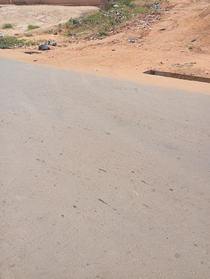 This image, taken in Akpaka Forest Reser, Nigeria, presents a ground-level view of a paved road transitioning to an unpaved shoulder and embankment. The foreground is dominated by a light grey asphalt road surface, exhibiting numerous dark stains and minor surface irregularities. No lane markings or pedestrian crossings are visible. To the right, the asphalt road meets a reddish-brown dirt and sand shoulder. A shallow, open concrete drainage channel with a square cross-section is visible at the immediate edge of the paved road and the dirt shoulder, extending towards the right side of the frame. Beyond the road and shoulder, an unpaved area of reddish-brown earth rises into a low embankment on the left. This area features sparse patches of green vegetation, primarily grasses and weeds. Significant amounts of litter are scattered across this dirt and vegetated expanse, including several dark plastic bags, white plastic debris, and other assorted refuse. In the far background, partially visible at the top of the embankment, is a light-colored, possibly plastered or concrete, wall or building structure. No people or animals are present. No specific actions or interactions are depicted. The scene is illuminated by natural daylight, indicating an outdoor setting.
