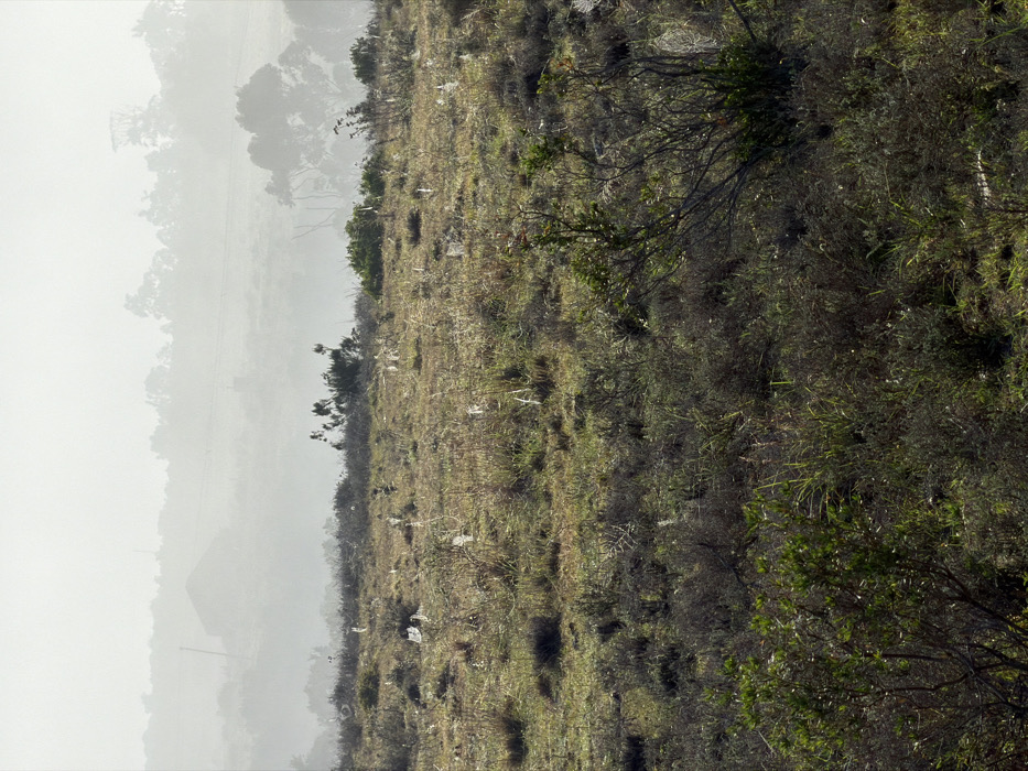 The image displays a rural landscape within the city of Hessequa Nu, South Africa, enveloped in atmospheric haze. The foreground and midground feature an expansive, uneven field covered with a varied array of vegetation, including dry grasses, patches of greener grass, and low-lying, scraggly shrubs. Scattered prominently across this vegetation are numerous glistening white spider webs, irregular in shape and appearing illuminated or dewy. The ground cover consists of muted greens, browns, and yellows. The background is heavily obscured by a dense layer of mist or haze, creating a diffused light. Through this atmospheric condition, faint outlines of structures are visible: a building with a pitched roof on the left-center, and a slender, upright structure, possibly a mast or tower, on the right-center. Beyond these, a line of trees forms an indistinct silhouette against the hazy sky, with distant hills further receding into the atmospheric obscurity. No people or animals are present in the scene.