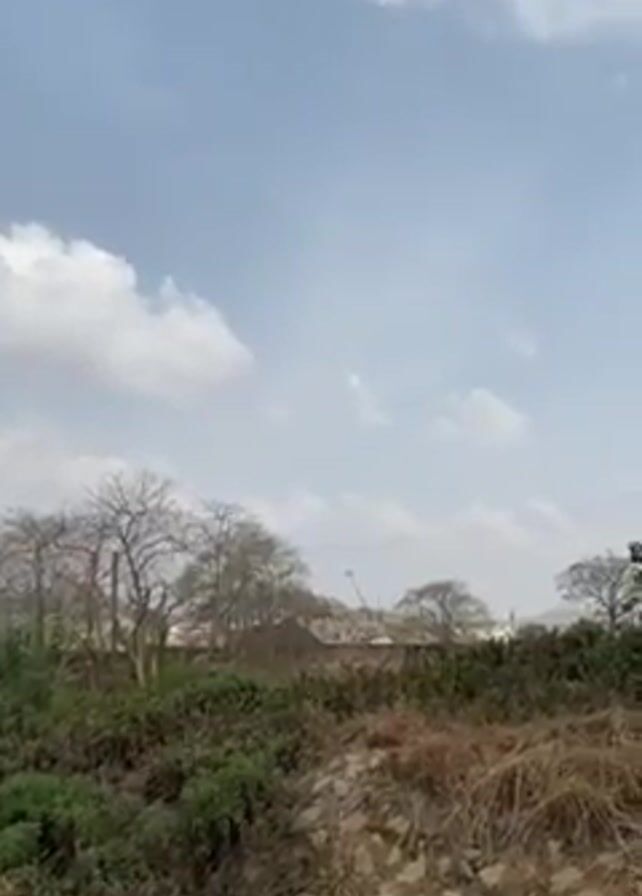 landscape under a bright, slightly cloudy sky. The foreground features a stone embankment and a patch of dry grass mixed with some green vegetation. Beyond this, there's a line of bare or sparsely leaved trees, possibly marking a boundary or edge of a property. In the mid-ground, one can see denser foliage of other trees and glimpses of what appear to be houses or structures in the distance. Power lines are visible stretching across the scene. As the camera pans to the right, a tall, slender tree with green foliage comes into view.