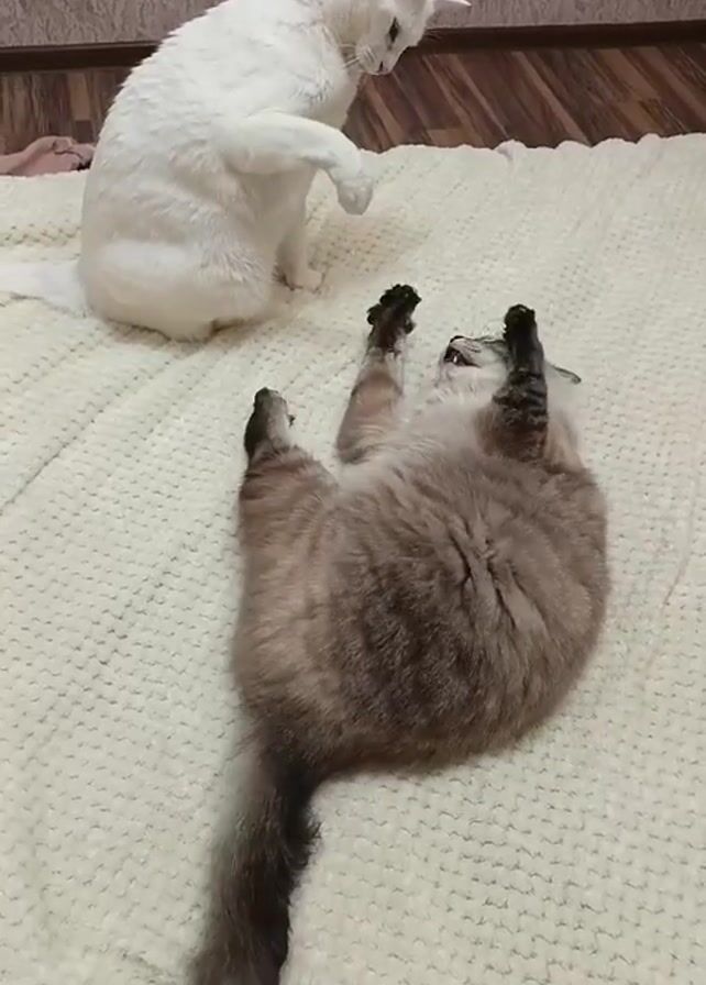 Two cats are on a white blanket. One cat is white and sitting while watching a gray cat on its back. The gray cat lies on its back and looks up. The white cat raises a paw toward the gray cat, who swipes up with its paw. The white cat moves around toward the top of the blanket.