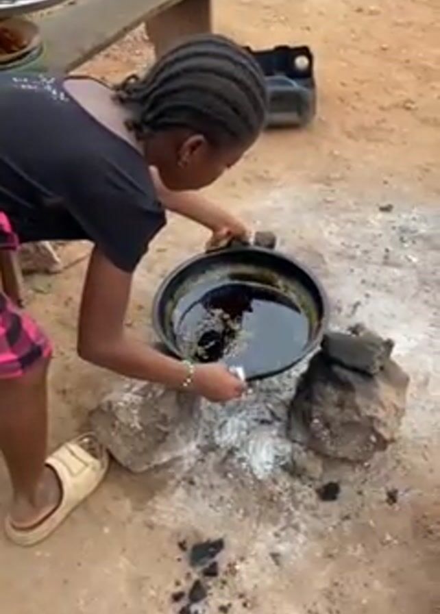 A young Black woman with braided hair is outdoors preparing food in a large pan over a fire