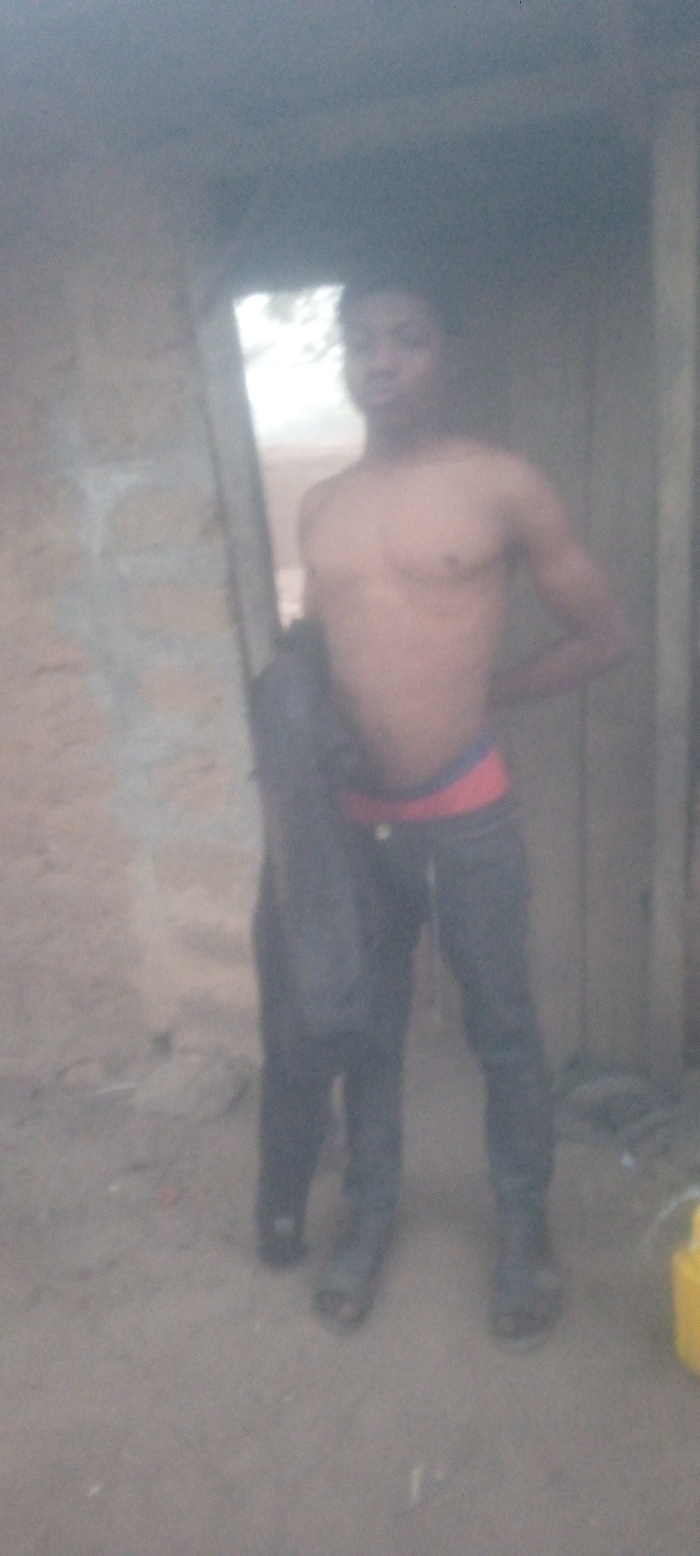 A shirtless young man stands in a doorway, holding a black jacket. He wears dark pants and sandals. The background consists of a rough wall and a wooden structure surrounding the doorway. The overall image is slightly blurry, and the lighting is subdued, making details difficult to discern. A yellow container is visible in the lower right corner.