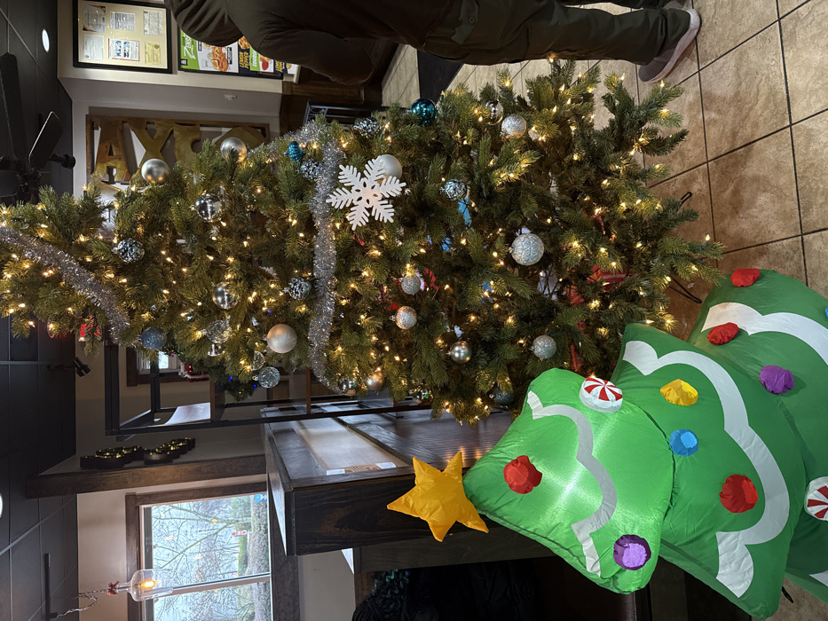 A decorated Christmas tree is centered in the image, adorned with silver ornaments, tinsel, and lights. Next to the tree are two inflatable, cartoonish Christmas trees and a yellow star. The image is taken indoors with a window in the background and the legs of a person in grey pants and shoes are visible at the top of the frame.