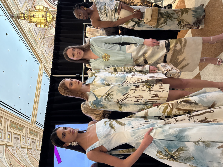 Four women stand in a row, showcasing patterned clothing. The outfits are similar in style, featuring a light color palette with tropical motifs like palm trees. The woman at the front wears a dress, while the others wear skirts, jackets or dresses. The backdrop includes a decorative ceiling and black curtains. The scene appears to be a fashion show or presentation.