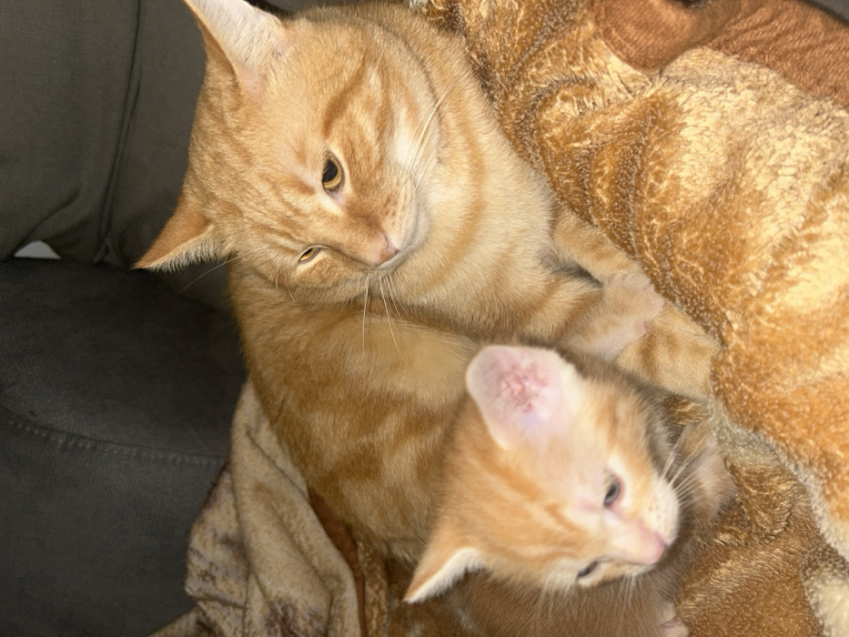 - "The image displays an adult orange tabby cat and a kitten of similar coloration resting indoors" by FM-ZvYlO2, licensed under CC BY 4.0