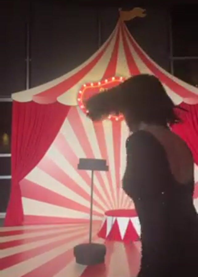 A woman in a long, sparkly black dress dances in front of a circus backdrop