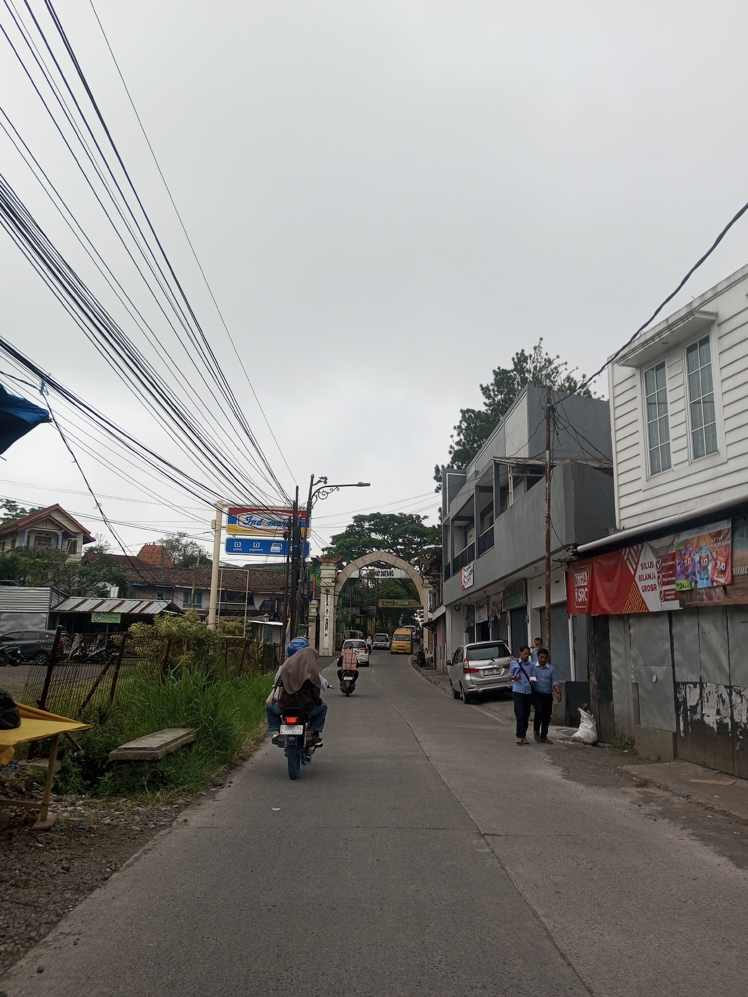 An asphalt road under an overcast sky extends from the foreground into the distance, flanked by buildings and utility poles. Numerous black utility cables crisscross overhead in the upper left quadrant. On the left side of the road, a yellow wooden table is partially visible in the immediate foreground. Beyond it, a patch of overgrown green grass and weeds contains a small concrete bench. Behind this, a metal fence and several parked motorcycles precede a low structure with a corrugated metal roof. Further back, a distinctive two-story house with a prominent gabled roof and intricate trim is visible, alongside other residential buildings with red-tiled roofs. A tall pole bearing a blue, red, and white "Indomaret" sign, displaying "pulsa," "payment," and "qris" in Indonesian, stands prominently. In the distance, a decorative archway, possibly a town entrance, has text including "SELAMAT DATANG" (Indonesian for "Welcome"). On the right side of the road, the lower section of a light-colored building with vertical siding features a red and white banner displaying "MITRA SRC" and Indonesian text "SOLUSI BELANJA GROSIR." A light-colored bag rests against the building's base. Further along, a two-story building with gray concrete walls and multiple balconies stands behind a utility pole. Trees with dark green foliage are visible behind these structures. Traffic moves along the road. A person wearing a light blue helmet and tan head covering rides a light blue motorcycle away from the camera in the mid-ground; its license plate reads "F 3969 FA." Another motorcyclist follows further down the road. Two men, both in light blue long-sleeved shirts and dark pants, walk on the right side of the road towards the distance. One carries a small white object. A silver minivan with license plate "B 1797 SKJ" is parked on the right. Other vehicles, including a yellow mini-van, are visible in the distance. The signs and vehicle license plates present in the image are characteristic of Indonesia, not Myanmar.